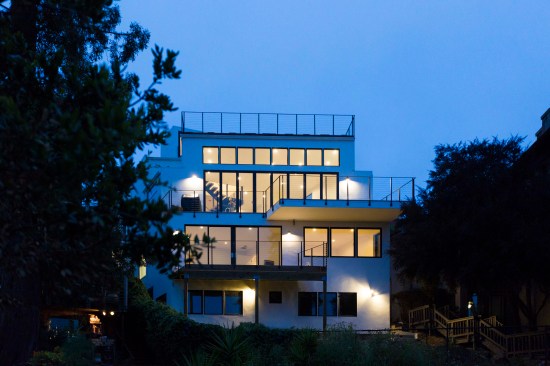 This home and integrated accessory dwelling unit were designed to specifically take advantage of unusual site conditions. The boundaries of the site are incongruous – no two edges are parallel, which created an opportunity to align to boundaries and create dynamic, yet functional spaces. The resultant folds are reflected in the external form and the interior space. The downslope lot afforded unobstructed panoramic views from the large open rooms though multi-slide doors and windows, and from the expansive living room and roof decks. This connection further enhances the relationship of the architecture to the larger regional context. The open interiors connect vertically as well as horizontally to create a fluid experience from top to bottom. In all the project is an integrated architectural experience that blurs lines between spaces and scales.