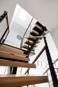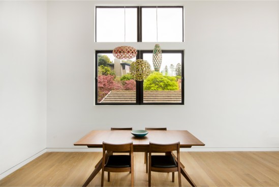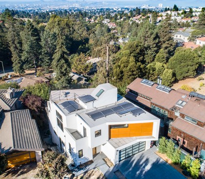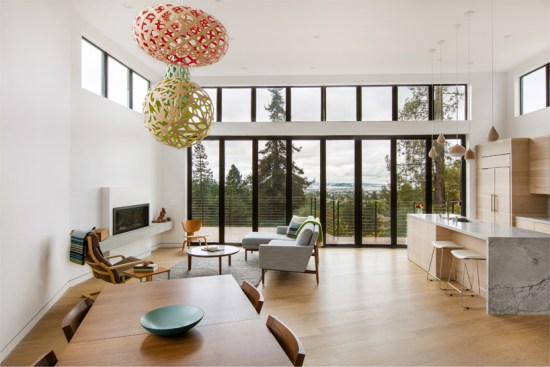 This home and integrated accessory dwelling unit were designed to specifically take advantage of unusual site conditions. The boundaries of the site are incongruous – no two edges are parallel, which created an opportunity to align to boundaries and create dynamic, yet functional spaces. The resultant folds are reflected in the external form and the interior space. The downslope lot afforded unobstructed panoramic views from the large open rooms though multi-slide doors and windows, and from the expansive living room and roof decks. This connection further enhances the relationship of the architecture to the larger regional context. The open interiors connect vertically as well as horizontally to create a fluid experience from top to bottom. In all the project is an integrated architectural experience that blurs lines between spaces and scales.