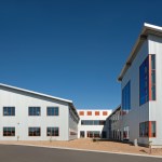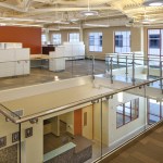 During construction of Building 1400, a master plan effort was initiated to create a campus feel, providing walkable connections between buildings, develop drainage swales to naturally irrigate landscape spaces, develop a distributed hydronic system for greater energy efficiency, and create a unifying edge to the campus.