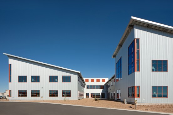 Redevelopment of the former Bureau of Mines campus began with the Lower Colorado Regional Office Building (Building 1400). The 49,000 sf, two-story office building draws on precedents from the historic buildings on the campus and merges characteristics of the architectural styles of Buildings 100 and 200 in a manner respectful of the historic neighborhoods surrounding the campus and the historically industrial use of the site to create a contemporary office building to house 150 employees consolidated from 6 disparate locations in Boulder City.