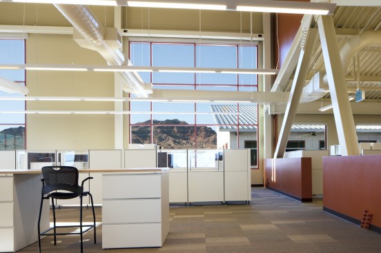 The building attained LEED Platinum level certification and achieved Net Zero energy consumption after the Phase II solar farm installation. Principles of daylighting incorporated provide 80 percent of the spaces to be day lit and more than 90 percent of the occupants to have direct views to the outside. Open office spaces with exposed steel frames allow daylight to penetrate deep into the workspaces and provide maximum flexibility and reconfiguration opportunities for the work environment.