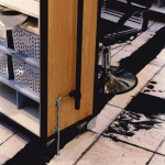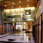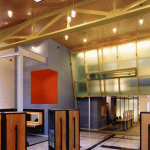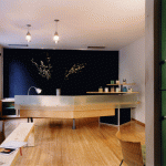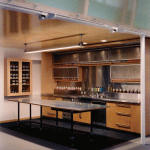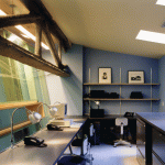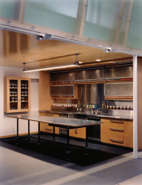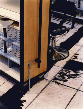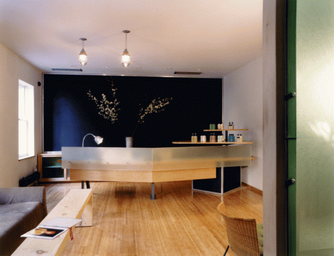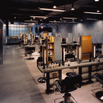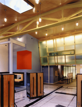 Against a blackboard backdrop, the second reception desk receives the visitor. Out from under the maple soffit of the mezzanine, the color stations plug-in to a power grid in the stained plywood floor, which is based on a drawing by Brice Marden. The painted floor addresses the inevitability of stains with additional drips and splatters accumulated over time helping to complete the drawing. The color stations or “steamer trunks” of maple plywood and blackened steel frames, fold up and roll away for photo shoots and seminars. Equipment fits inside, and each unit contains lighting and storage. They are hinged and lockable, offering the users complete adaptability as well as the ability to reconfigure the space. The maple ceiling bends and folds over the double height space with clear industrial globe lights dripping from the ceiling and scattered above the work area. Natural light pours in through three giant galvanized light scoops. Along the north side of the double height space a fiberglass, acrylic and poplar “billboard’ is hinged to the mezzanine and leans out over the space, a screen with light and silhouettes animating the color floor below. A green plaster wall reaches up to the mezzanine level to anchor the glowing acrylic and steel grating bridge which leads to the mezzanine. One wall of the space is actually the ‘billboard’ through which the executive offices have an over view of the studio’s frantic pace below. With unexpected combinations and assemblages of architectural elements, reiterated materials with depth and texture connections and dichotomies are formed creating the coherent feel and function of the salon. Quiet and private, public and noisy, our task was to make it a destination. Clients coming to participate in their own transformation also participate in ours.