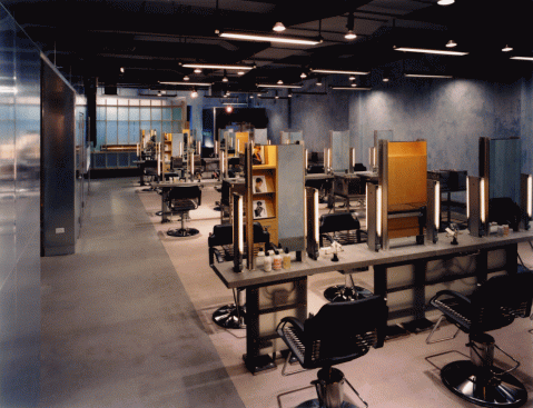 Immediately upon leaving the street, there is a sense of dislocation. The ground floor salon is a blue plaster box with a poured acrylic cement floor. Smaller, discreet structures were inserted into the larger space where they serve as both signs and directional devices which lead one through the salon. They are buildings along a route: reception, product/store, salon, cafe. The reception box, visible from the street, glows like a lantern after dark. A galvanized metal-paneled wall contains storage, computers, graphic display and a cafe as well as an entry to the stair tower which accesses the rest of the salon. The cafe, clad in maple and chalkboard swallow light while softly glowing. The cutting stations are assembled from poured concrete counters, lights and mirrors supported by aluminum brackets supporting, and fiberglass panels mounted over a steel frames. They provide a dynamic mix of privacy and exposure. The last component of the ground floor are the dressing rooms and adjacent shampoo area defined by a continuous bolt of fabric tautly woven around steel pipes, private enclosures for changing are formed. The lighting in the salon is a combination of incandescent and fluorescent fixtures establishing flattering light levels and color balance. The floors are linked by a stairwell with specific lighting, sound and material characteristics. A two-story tower made of steel angles clad and metal grating rises within the space, housing lighting and sound equipment. Greenish plaster walls and floors mixed with the steel give the space an “aquatic feel”. The structure pins the program together as clients move from floor to floor. Translucent fiberglass and acrylic screens form the reception and transitional spaces from the stair tower to the color/third floor. Giving partial privacy while transmitting light, this combination of materials is found throughout the project.
