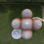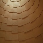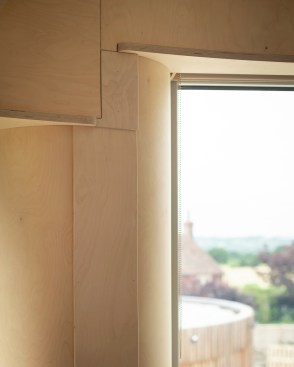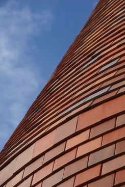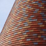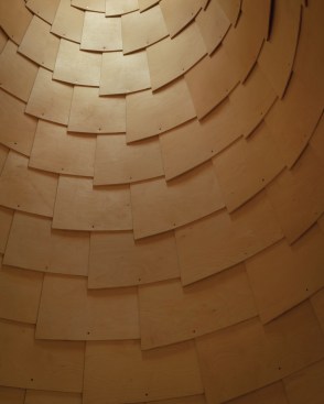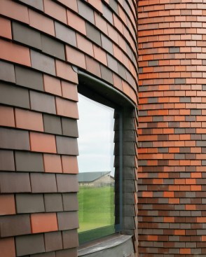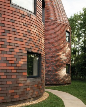 Kent-style tiles have been used to create the exterior skin in six shades, slowly fading from dark red at the base to light orange at the tip. These were produced using local craft skills and the tiling work was a huge technical challenge. Every tile above eaves level has been individually cut, with over 41,000 used across the whole facade. The interior of the roundels is clad in plywood, as a continuous surface for the cylindrical parts, and as overlapping plywood shingles for the roof cones. Curved furniture is built into the rooms where possible to make the best use of the space.