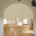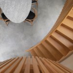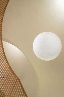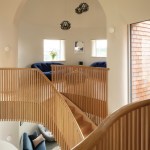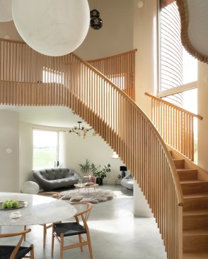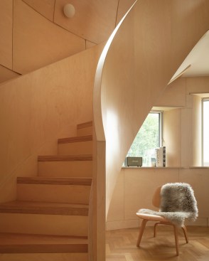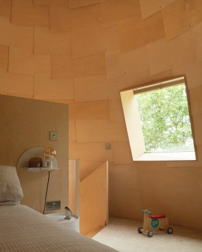 Each of the bedroom spaces is split level, which creates a play space for the children on the lower level that can later be adapted for study, while the master bedroom is designed with a dressing area in the upper space that opens onto an en suite. Helical stairs lead the family into the conical sleeping spaces, with thin balustrades made of gently curving plywood.
