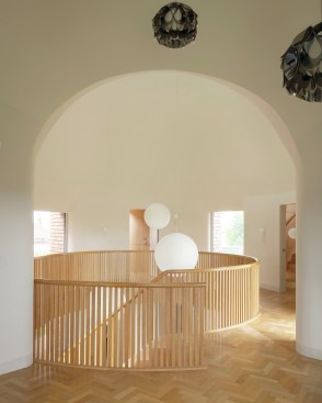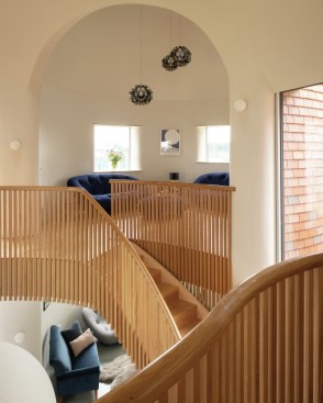 The proportions of the tower roundels were based on a traditional oast and they stand slightly apart from one another; creating views inwards and outwards, and housing private functions such as bedrooms, bathrooms, and service spaces. The towers are all connected to a triple-height central space that opens out to an orchard setting and forms the heart of the house.