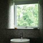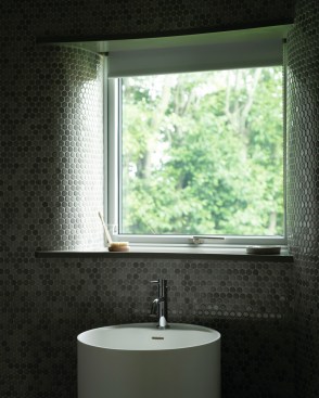 The bathrooms have been created as open-plan niches with no screens, therefore the room size is designed to match its purpose and allow for in-built storage. Microcement is used again to pick up on the materials downstairs and to accommodate the unusual geometry of the interiors. The downstairs bathroom uses mosaic which echoes the grey tones of the concrete. As it is a north-facing room, matt and gloss finishes have been employed to play with reflections from sunlight as it enters the space. In fact, all window openings have reveals formed by the walls folding into them, which increases the light refraction coming into the rooms.
