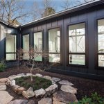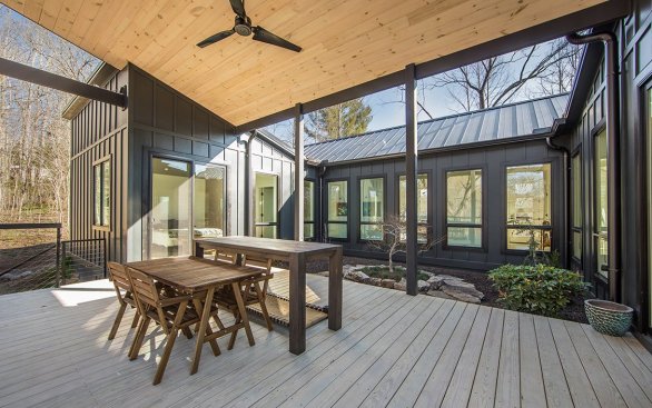 Burrell Mountain Home is a striking, two-story single family residence on Burrell Mountain in Brevard, N.C. The design called for a Norwegian-style home with a distinct “U” shape that centers on an outdoor courtyard and connects the outdoor/indoor space from any room in the home. The concept also fits seamlessly into the natural landscape while complimenting the owners’ personal needs and lifestyle. The clean lines and light colors of the interior fill the home with natural light and warmth while the dark color of the exterior fades into the hillside. The home features a standing seam metal roof, custom concrete countertops, a contemporary gas fireplace, stainless steel cable porch railing and white pine shiplap siding on the sloped exterior and interior ceilings. Two large, covered decks on the front and rear of the home expand on the indoor space for entertaining. An outdoor shower and bike wash area, as well as a finished guest suite downstairs with a separate entrance, are a reflection of the owners’ priorities of sharing their home with friends and family.