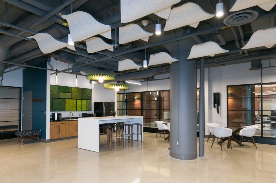 The new office space includes a custom aviation reception desk, sculptural acoustic treatments, new custom designed wall coverings, and moss artwork. Our team worked closely with Burris Law, Stroh River Companies, and ISCG to provide an efficient design and a quality project that was completed within a tight timeframe.