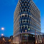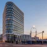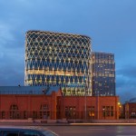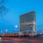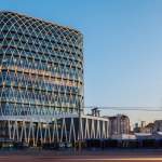 The business center project was developed by the UNK Project architectural bureau. A distinctive feature and recognizable element of the architectural appearance of the building is the openwork, grid-like shell on the facade. This principle is widely used in the progressive architecture of the 21st century and it also refers to the model of Soviet constructivism, reminding of the tower of engineer Shukhov. Triangular at first sight in cross-section building has no sharp corners. They are rounded and closed with a mesh structure that softens the appearance of the building.