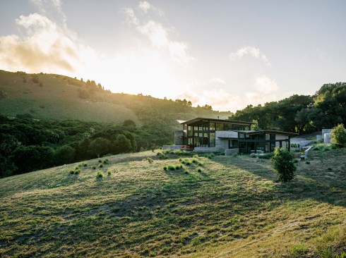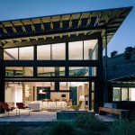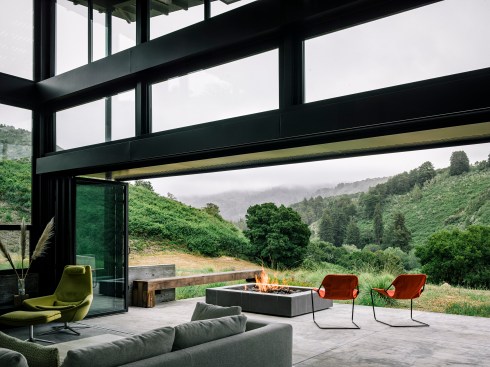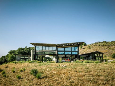 Each pavilion has a separate function: the central pavilion houses the main living, dining, and cooking spaces, while two other pavilions provide for sleeping, bathing, and relaxing. The structures are modest in square footage, yet each expands into outdoor rooms that open up to dramatic views of the canyon below and hills beyond.