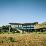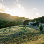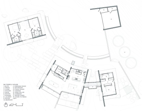 Beyond poetic gesture, the butterfly roofs bring in views of the surrounding hills, thrust the internal living spaces into the landscape, and also harvest rainwater. Water is celebrated throughout the design. Each roof funnels water onto to a rain chain fountain and into landscape collection pools, which then gather it into cisterns where it is stored and used to irrigate the landscape. In addition, the pavilions were sited to allow water to flow under the office bridge and for storm water to seep slowly into the ground in the main courtyard.