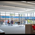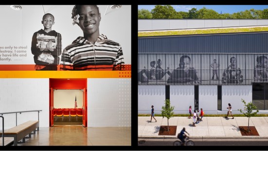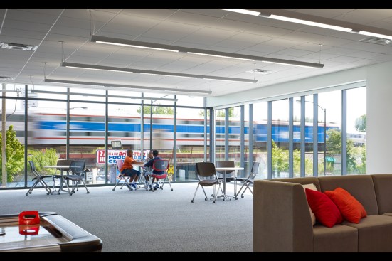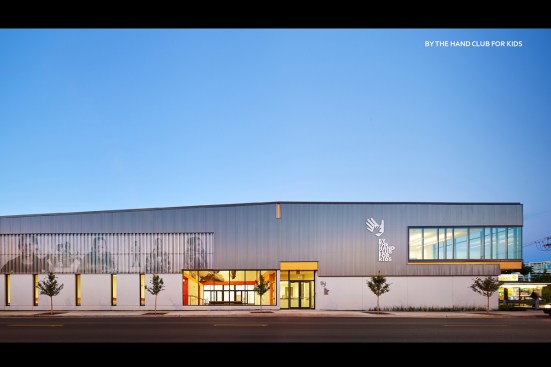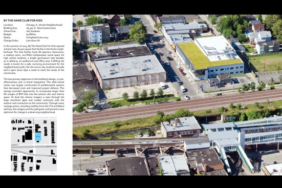 In the summer of 2013, By The Hand Club For Kids opened a brand-new 26,300 square foot facility in the Austin neighborhood. The new facility hosts (8) spacious classrooms, a reading room, sun-filled multipurpose social space for high school students, a bright gymnasium that doubles as a cafeteria, an auditorium and office area. Fulfilling the needs in Austin for a safe, nurturing environment for the neighborhood youth, the site serves 264 students annually and is open seven days a week to meet the needs of the community. The two primary objectives in the building’s design, 1) cost- effectiveness and 2) brand integration. The after-school center was largely constructed of prefabricated systems that decreased costs and improved project delivery. This savings provided opportunity to incorporate larger than life images of BTH kids into the exterior skin and interior space. At dusk the interior imagery is seen through the large storefront glass and creates continuity with the exterior and connection to the community. Through many vantage points, including visibility from the CTA and Metra rail lines, the imagery and the 50% green roof present a new optimism for change in a deserving neighborhood.