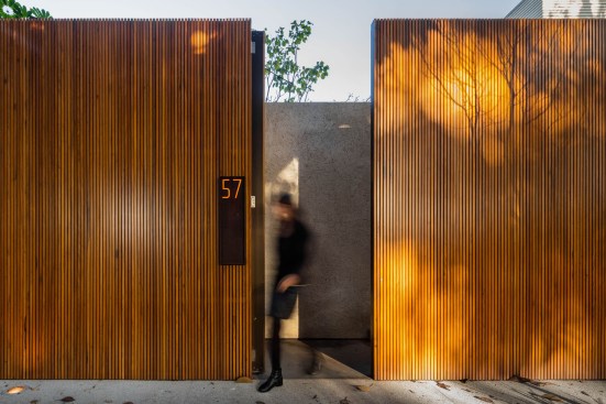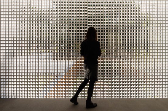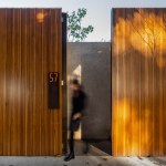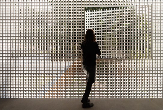 The volume of the more intimate areas is also clad in wood, but with a different treatment: a white-painted mashrabiya. This façade system is freestanding with pivoting windows that are totally imperceptible when closed. It also works as a light filter, allowing for a controlled transparency. The entire project revolves around this dilution of limits between the interior and exterior, creating an intense and spatial dynamic.