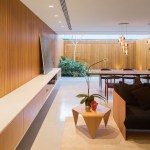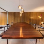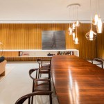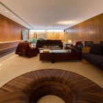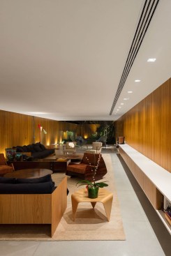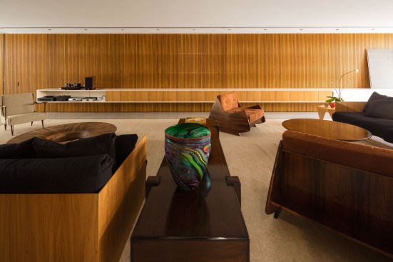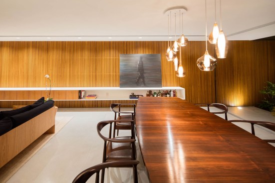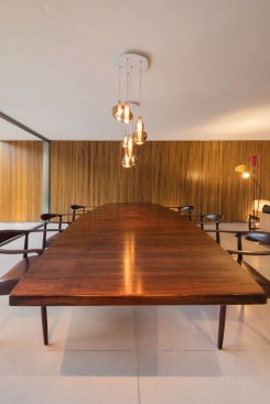 The 12-meter long sideboard, which is present since the initial conception of the architecture project, is another element that connects the living and dining rooms and has many uses: it holds from special music equipment to personal objects and the bar. The furniture is a mixture of antique pieces and re-editions of international and Brazilian modern furniture, creating a classic and cozy atmosphere.