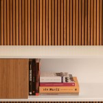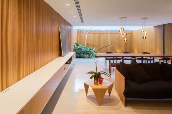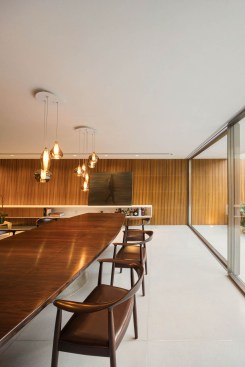 The use of freijó wooden slats on all the walls in the social and leisure areas, as well as the window frames collection system in the living and dining rooms, generate a feeling of continuity and transform the covered area into a giant veranda. This feature also allows the camouflaging of the kitchen and music room accesses, which, when necessary, can be opened and configure a single space. One of the residents loves music and uses the studio for classes and performances at more intimate parties in the house.