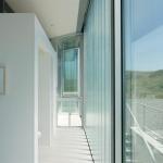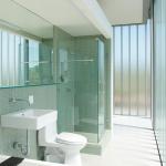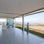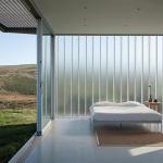 To withstand up to 100-mile-per-hour winds from multiple directions, the house was designed to be tough. The glazing strategy follows a diagonal division of the house: transparent windows and sliders set in steel framing on the northern and western façades open to water views; on the south- and east-facing façades, views are blurred with channel glass overlaying the steel frame. Juror Raymund Ryan thought the channel glass “was an interesting way of developing the particular historical trajectory [of the glass house].” While acknowledging that channel glass is associated with institutional buildings, Sample thought its material toughness was appropriate, “For this landscape, which does seem barren, the channel glass provides another kind of surface, or screen, that seems to play up the quality of light.”