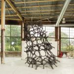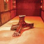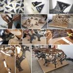 Of course, the cardboard molds would ignite in a regular kiln, so Area built an elementary oven powered by 18 infrared heat lamps that max out at a relatively cool 260 F. After baking for four hours, the hardened carbon fiber pieces are soaked in water to remove the molds. Meanwhile, a parallel set of cardboard pieces are formed into a mock-up tower, or dummy jig. These are then swapped, one by one, for the carbon fiber components. Glued-on node plates and cotter pins connect the components, which can be quickly disassembled and reassembled.