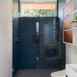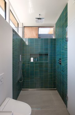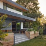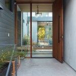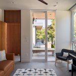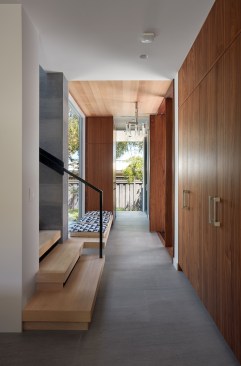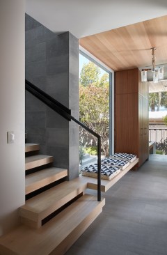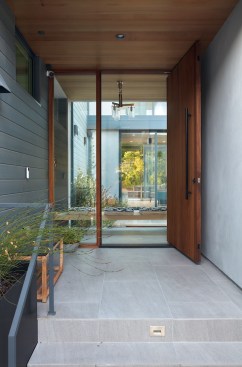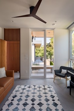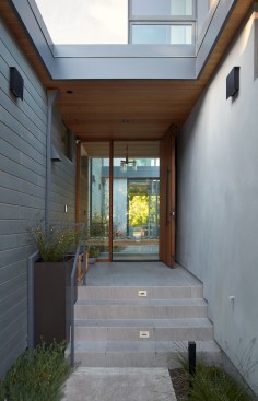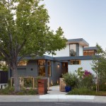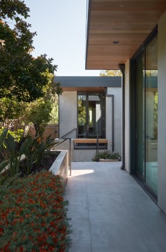 Conceived of as a C-shaped house with a small private courtyard and a large private rear yard, this new house maximizes the floor area available to build on this smaller Palo Alto lot. An Accessory Dwelling Unit (ADU) integrated into the main structure gave a floor area bonus. For now, it will be used for visiting relatives. One challenge of this design was keeping a low profile and proportional design while still meeting the FEMA flood plain requirement that the finished floor start about 3′ above grade.