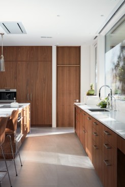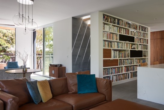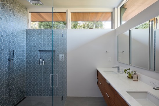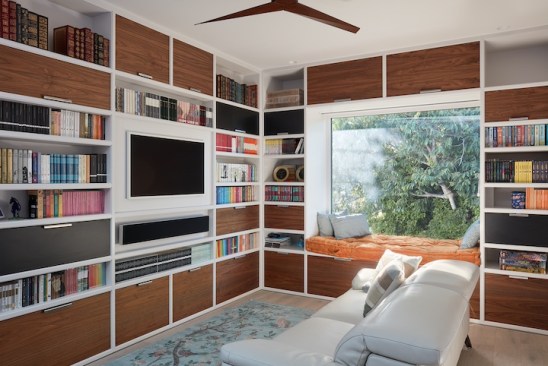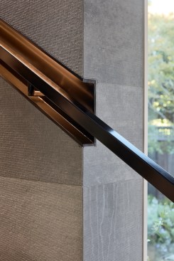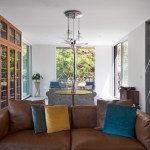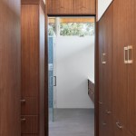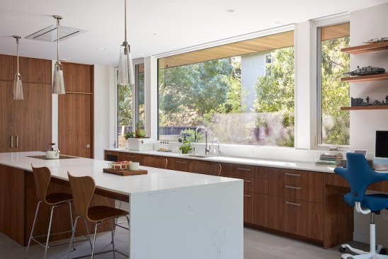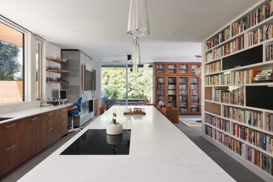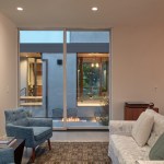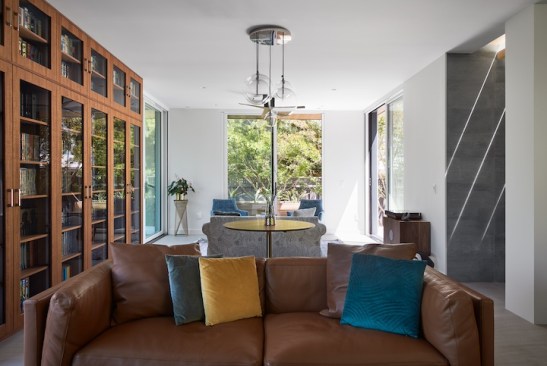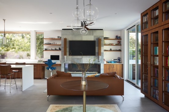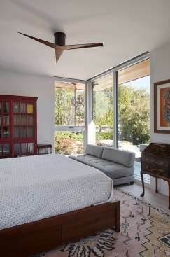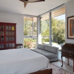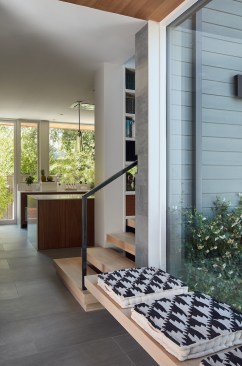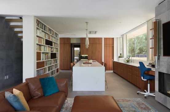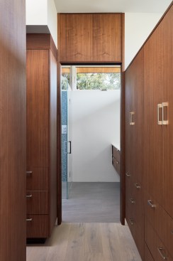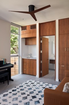 The new house has four bedrooms (including the attached ADU), a separate family room with a window seat, a music room, a prayer room, and a large living space that opens to the private small courtyard as well as a large covered patio at the rear. Mature trees around the perimeter of the lot were preserved, and new ones planted, for private indoor-outdoor living.