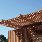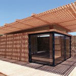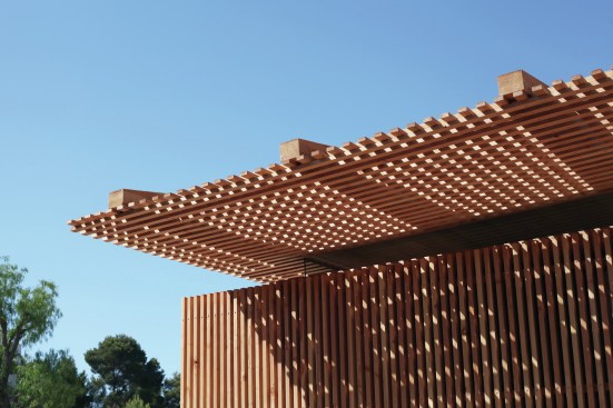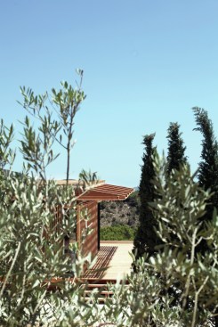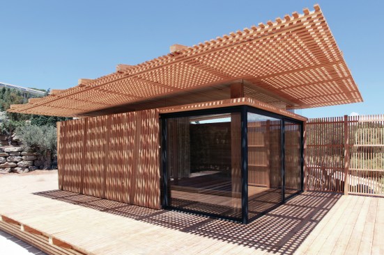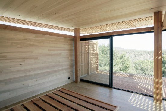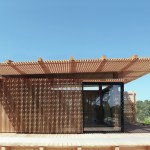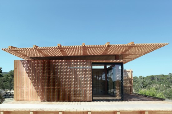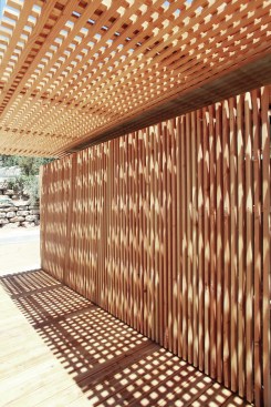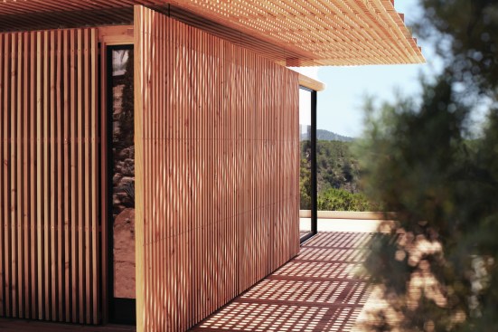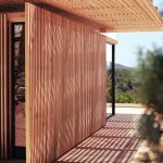 The architecture is designed according to island’s climate. Facing south and overlooking the valley and the sea, the roof and walls have been oriented so that the inhabited volume and outdoor spaces are always naturally shaded. The different densities of the vertical wooden screens around the hut guarantee the privacy of its occupiers as well as sheltering them from the sun and the wind. The interior space as well as the exterior are therefore protected from the sun thanks to the pergola overlaying the terrace. The entire reflection was brought to the geometry of the roof, the pergola, and the glass surfaces, resulting in a luminous and naturally ventilated environment both day and night.