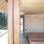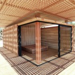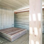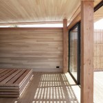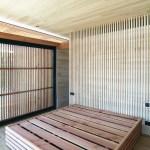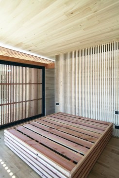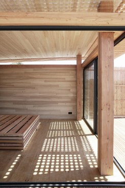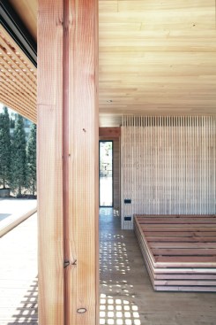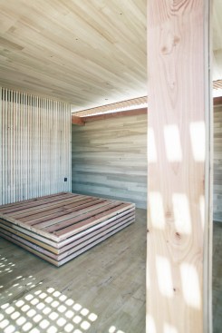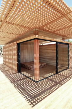 The parquet is chestnut wood, chosen for its strong resistance to wear. During the day, the experience inside the suite is a show of light and shadow with the sun filtering through the screens. After sunset the effect is reversed, immersed in darkness and illuminated only by the moon, the hut evokes a lantern, radiating the internal golden light between the wooden slats.
