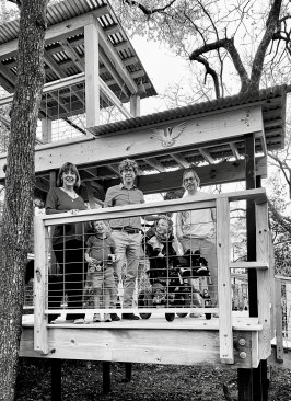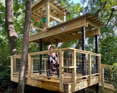 The clients live in a suburban neighborhood on a large lot that is landscaped with mature native plants and trees. They wanted a treehouse that could be enjoyed by the whole family, including their non-ambulatory granddaughter. The treehouse is visible from their kitchen, but also blends in with the surrounding vegetation.