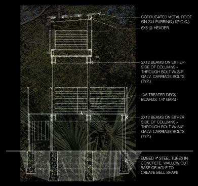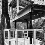 A minimal railing system of wood and hog-wire not only preserves views from the treehouse, but through the treehouse to the trees surrounding it.