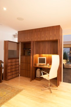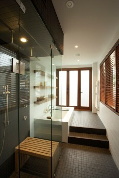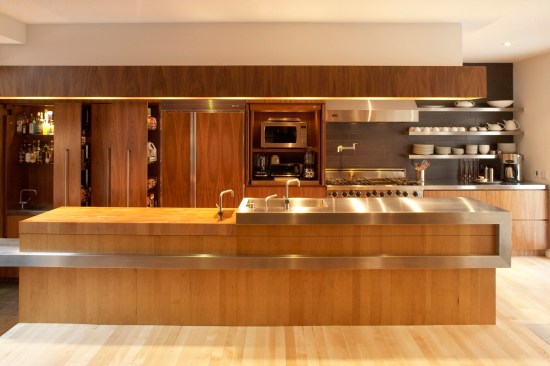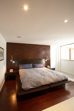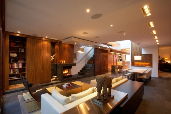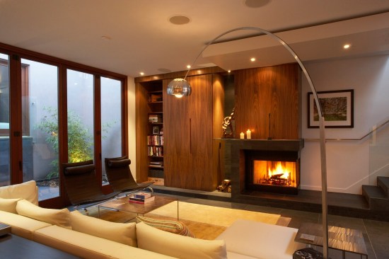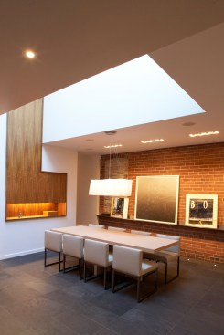 The epitome of modern design this Cabbagetown Coach House makes the most of the small amount of space by taking a minimalist approach to maximize all the functions of daily living. The 2,500 sq. ft. home is a marvel of contemporary living. A two- storey atrium space of the dining room opens up the house and allows for a spacious kitchen. A room that is to be well-used by the owners, details include an “appliance garage” and stainless steel counters with a built-in chopping block. An outdoor courtyard is accessed through bi-fold doors off the living area and also from the private master bath bringing the outside space in as part of the interior. A bridge from the master bedroom also allows access to the outdoor space at the second level.