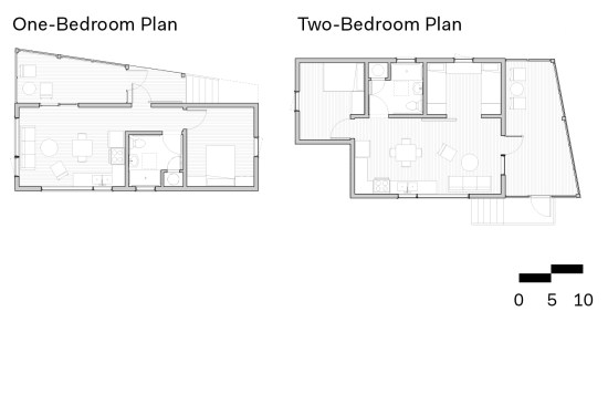 The cabins’ simple program includes a bathroom, kitchenette, and screened outdoor porch. In the two-bedroom unit, the kitchen/living area is 12 feet wide by 23 feet long; a barn door to the second bedroom can slide open to enlarge the communal space during the day. The living area of the one-bedroom variation is just 12.5 feet by 16 feet, but opens onto a screen porch for additional square footage. The kitchens are small, but each is equipped with a sink, refrigerator, microwave, and electric range cooktop with oven, as well as DuPont Corian countertops. Bathrooms are somewhat sparse, but fully accessible with zero-entry showers.