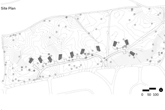 The final site plan was determined in situ: WXY’s designers staked the location of each cabin with flags and adjusted the composition in the rolling landscape to give the perception of diverse forms, while leaving the forest as untouched as possible.