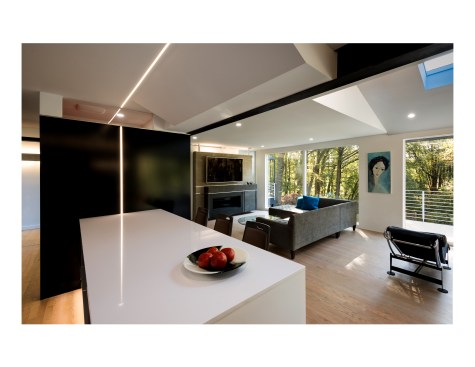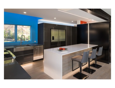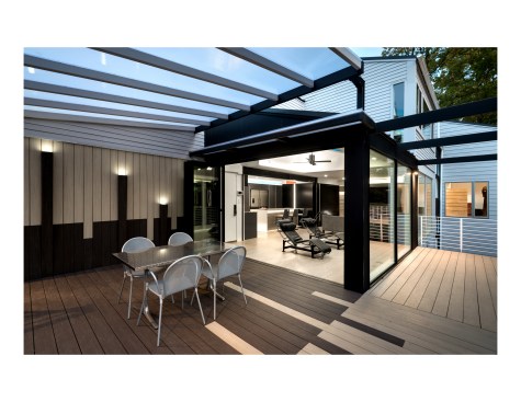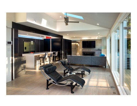 The main level of this three story residence was completely remodeled, in order to unify the living spaces and open the interior to views of the park with new floor to ceiling doors and windows. Decks were re-configured to become outdoor rooms. The home’s exterior received a facelift, which included all new cladding and roofing. Materials used inside and out are Viroc, Hardie panel, polygal canopies, steel railings, NANA wall, mdf panels and LED strip lighting.