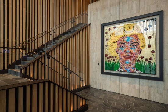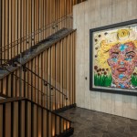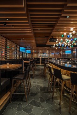 The entry marks one’s arrival with a dramatic double height space. The glass and bronze stairway is enveloped with an intricate wood slat feature element that wraps to become the ceiling. From there dozen glowing Louis Poulsen Artichoke pendants in a custom oak finish are suspended overhead, inviting guests up the rooftop.