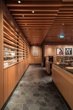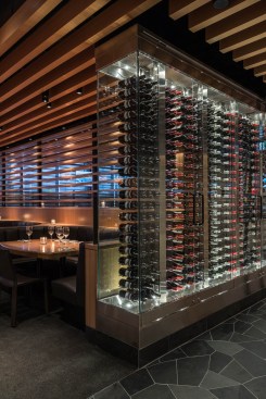 With seating for nearly 450 guests across two floors, the ground level lounge and dining rooms are clad in the signature material palate, also developed by Assembledge+, consisting of the cornerstone finishes rift-cut white oak, oil-rubbed bronze, and dark leather. The interior design epitomizes the Cactus Club brand with its clean, modern, and sumptuous aesthetic. A continuous ribbon of wood ceiling transverses the space, creating a cohesive design element that unifies the experience.