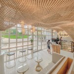 Since Rattans and Bamboos are the two command materials found in Laos, we have decided to use it as our main materials for the design features. We have applied these materials to our design in such a way that, it has a soften look on the surface and finishes, yet it also plays a big part in the overall structure. To create a focal point, at the entrance we have added some design features on the wall that goes all the way up to ceiling, where it could be seen easily through the glass doors when the customers are passing by. This sculptural design feature was done using a locally sourced rattan. To execute a unique design that brings the “Old” and “New” together, during the design process we have worked on both parametric design programs and study about the traditional way of rattan weaving in Laos as well.