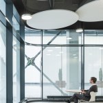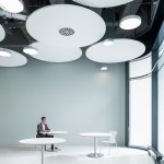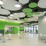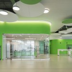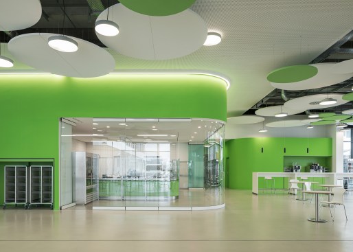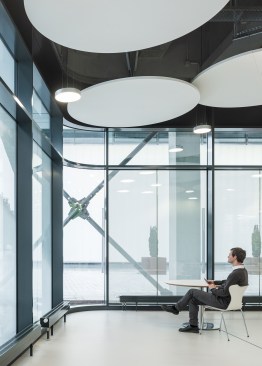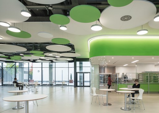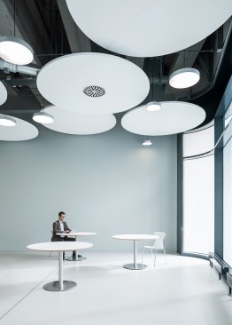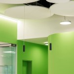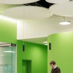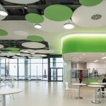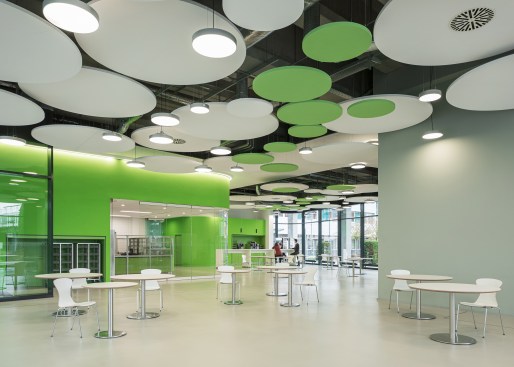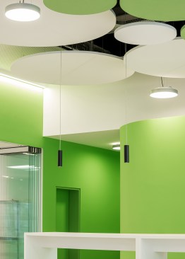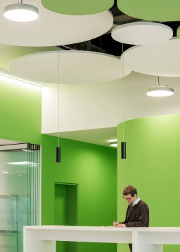 The differentiated room zones are formally connected by circular acoustic panels. The elements with different diameters are suspended from the ceiling at varying heights and form an artificial sky with alternating white and green circles that add a fresh colourful touch to the interior.