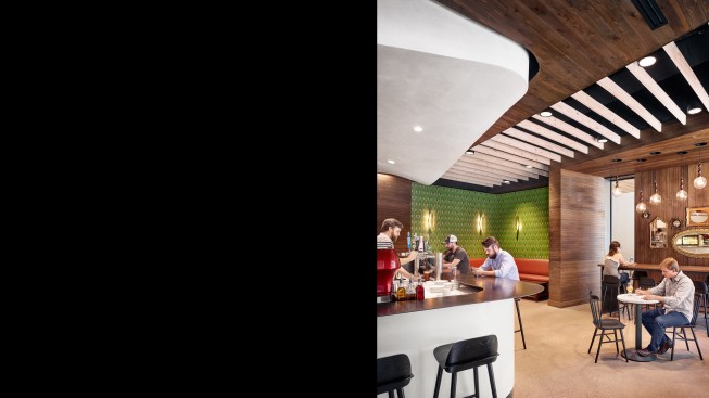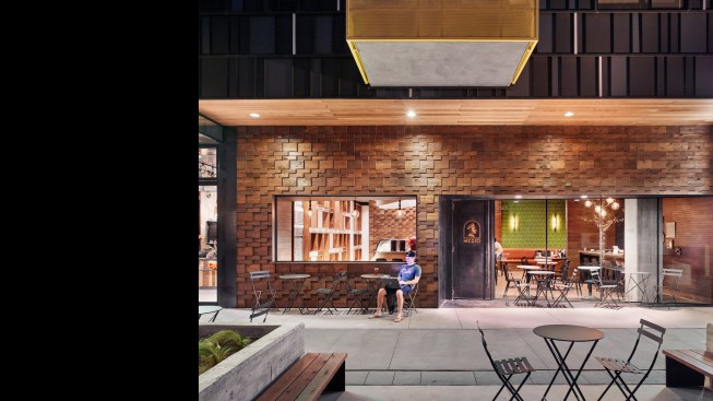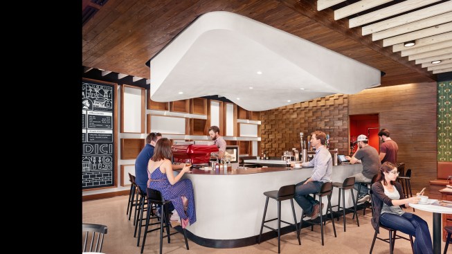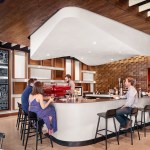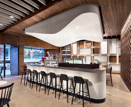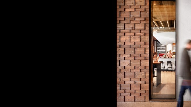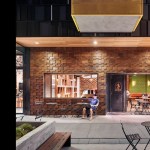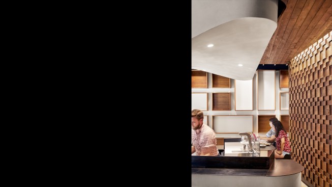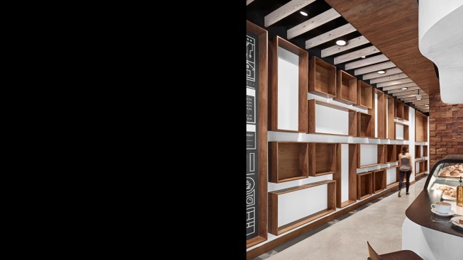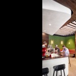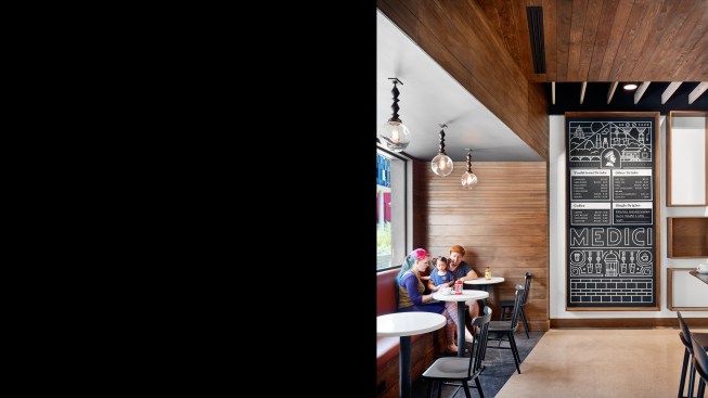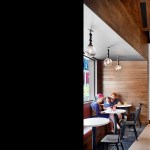 The concept for the new Caffé Medici is a deconstructed bungalow. The design borrows from the archetypes of the traditional bungalow home and recreates it so the architecture feels familiar and also intriguing. The interior emulates the coziness of the bungalow without being literal in its approach. It all starts with the spatial transition between outside and inside? throughout the idea of the porch. A steel portal frames the door and the windows, proud of the wooden scale-like facade which evokes the old wood shingles used for siding and roofing, placed horizontally to create a more pronounced pattern. The entry steel door at the porch leads to the main room where the hearth, or chimney, becomes the focal point. The hearth of the space is the bar, where the barista greets you and showcases the art of crafting espresso drinks. The bar is defined by a wavelike plaster ceiling that evokes fluidity found in fire & water? both critical elements of the coffee roasting and brewing process. There are also small rooms within the main space, each catering to a different type of experience at this new Caffé Medici.