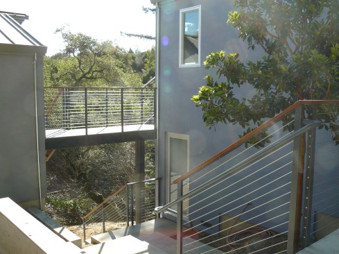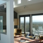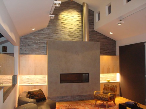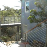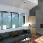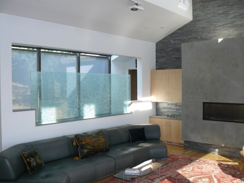 A design theme making innovative uses of glass runs throughout. The totally glazed gallery space running along the front of the house, from the living room to the master suite, prevents an intrusive sightline from the street directly into the living room by a triple laminated glass panel. The middle layer of this panel is tempered glass, which was deliberately broken, which crazes almost uniformly throughout, just like a tempered glass door. This crazed layer was then encased on both sides by laminated glass layers, thus producing a screen that is both visually arresting and utilitarian for the owners’ privacy.