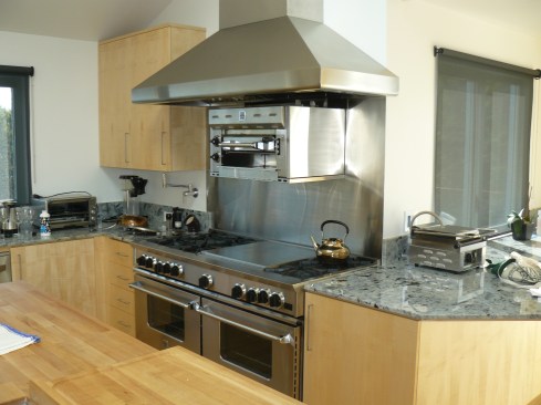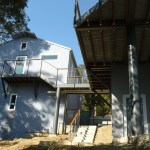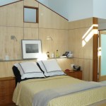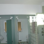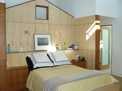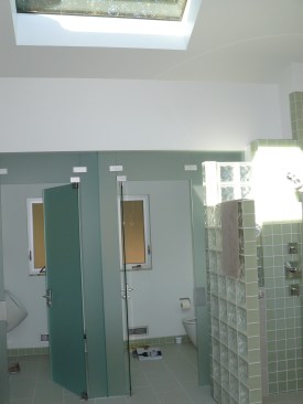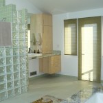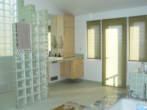 Another glass feature are the “his” and “hers” toilet rooms at one end of the cathedralled and skylit master bath. Each toilet room’s “walls” are full-height fogged glass, giving the owners visual privacy while still admitting the dramatic natural light. In addition, in the 2 headed master shower, glass block walls on 3 sides are of a more obscure pattern below and a less obscure pattern above, to increase natural daylighting while protecting privacy.
