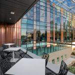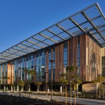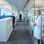 Mimicking the helix that links a strand of DNA, the entrance lobby reveals a serpentine stair that meanders up into the building Nucleus. This journey is not linear and the arrival at the Nucleus is unexpected. Transparency and order are the guiding concepts for the laboratories. Glass walls and doors ensure natural light and ease of movement between computational work and environmentally controlled research space. Equipment and systems are thoughtfully organized and unified through a warm color palette with accents of color that act as coded elements to ease wayfinding. These gestures come together with the intent of bringing a softer, more human touch to spaces dedicated to hard science.