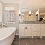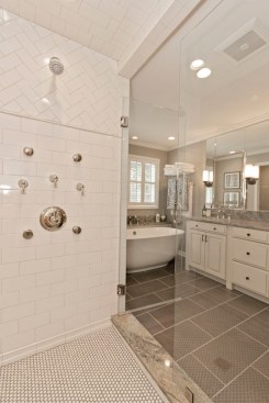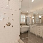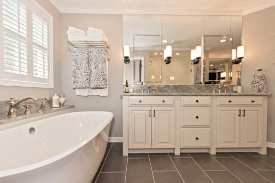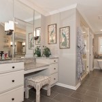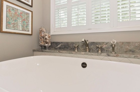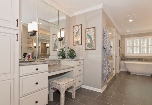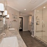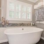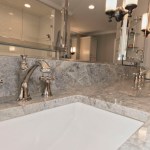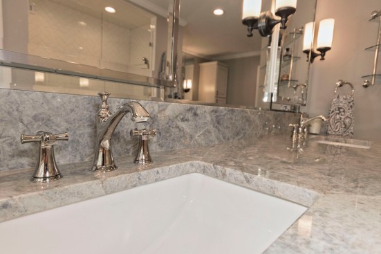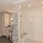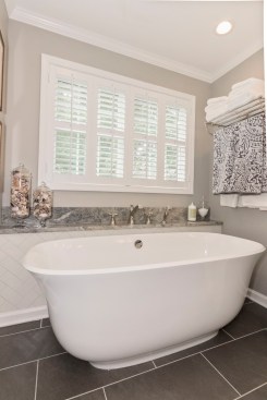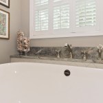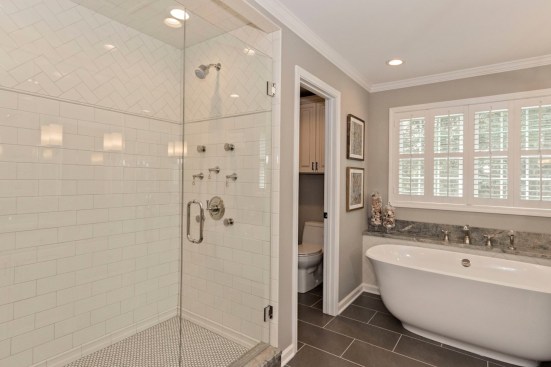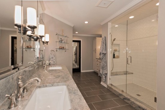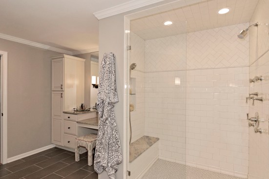Design of the 200 square foot master bath remodel began in order to meet the joint pain problems of Mr. Client and Mrs. Client’s style needs. The client required utilization of existing footprint, maximizing use of space, providing warm water therapy areas to alleviate joint problems, and creating an understated, yet elegant, traditional style. Challenges: · Master bath entry through narrow and dark corridor due to closet in master bath footprint · Closet size too small, clients repurposed sitting room in master bedroom as new walk-in-closet prior to bath remodel · Inadequate natural light from half-circle window · Standard shower too small for Mr. Client’s size · Poor ventilation at shower · Water closet small and dark · Tub with deck too large for space · Bath lighting was dated and inadequate · Vanity size too small with two lavatories for clients Design Solutions: · Eliminating closet opened up entry to master bath · Window replacement provided more natural light · Water closet expansion with new door location due to removal of shower, shower plumbing wall, and closet · Extension of water closet wall created space for new, custom 72” tiled shower pan with bench · Plumbing wall relocated; body jets added for warm water therapy need · Large, free-standing, deep soaker tub for warm-water therapy replaced tub and deck · Tub removal also created more floor and wall space for larger double vanity · Two recessed mirrored medicine cabinets provide above counter storage, limiting bending to access vanity storage · Additional make-up vanity cabinetry designed for Mrs. Client, adding valuable storage solutions, design aesthetic, and function · Added lighting, both general and task, resolved initial lighting problem · New smart technology exhaust fan with humidity and automatic on/off motion sensor rated for room size installed to improve ventilation Special Features · Large beveled mirrors above vanities enhanced lighting and design with layering effect · Tile detail in shower with varied pattern of running bond and herringbone offers visual interest, and repeats color of painted cabinetry · Roman tub faucet atop insulated knee wall with herringbone tile wainscot repeated from shower · Durable large porcelain dark taupe floor enhances room scale and color is repeated in glaze on cabinetry, wall mounted light fixtures, and hardware · Repetition of resiliently beautiful quartzite on countertops, bench, shower threshold at custom tiled pan, and cap at knee wall unifies space · Polished nickel plumbing fixtures add to the elegance of this master bath’s traditional, elegant aesthetic · Crown moulding at perimeter finishes the space