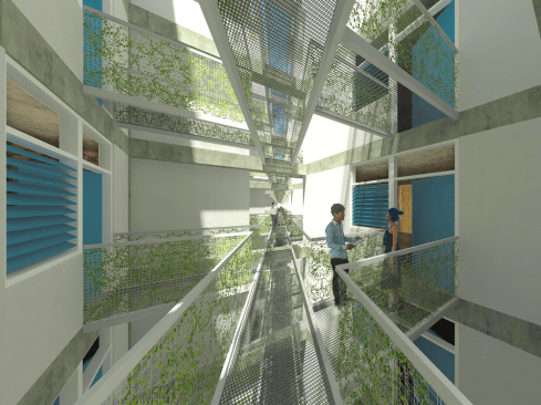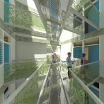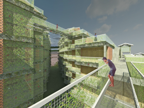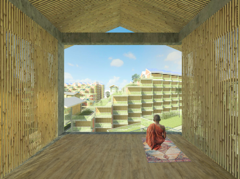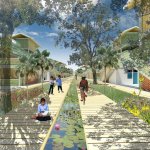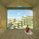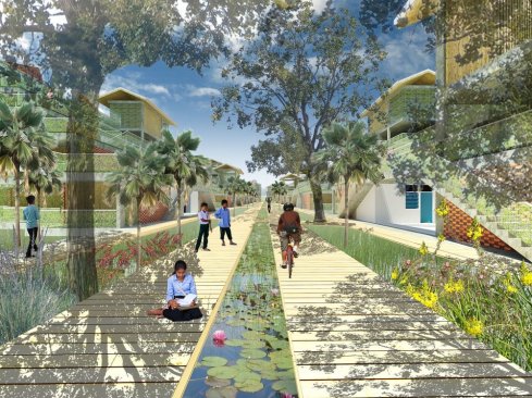 A pedestrian ‘river’ carves a canyon through the built environment and in the process creates a series of terraced communities – referencing Cambodia’s mountainous rice fields. As the walkway branches, forming a delta as it reaches the river, smaller, pocket neighborhood blocks are formed. A channel cut into the walkway ensures the river is not merely symbolic as the intention is for water to follow this when receding from the floods. Shaded from the sun, the canyon floor becomes the neighborhood park, the market and general community gathering space. The first 6 levels are accessible. During flood season, its likely water would follow this course to the river. The tallest structures are set farthest from the river, thereby allowing more units to have views and access to natural ventilation. A perimeter road around the site allows vehicular access.