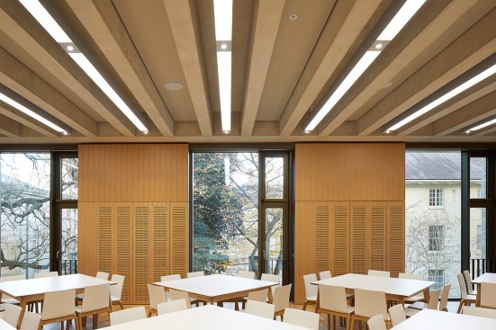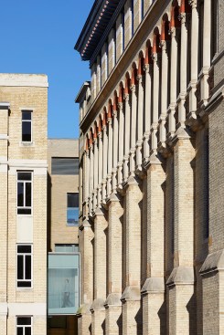 The three primary phases of building remain clearly legible in the new design, expressing the “layered” history of the site, but share common concerns in their language and organisation. The height of the original nineteenth century hospital wards establishes principal floor levels and room heights across the site; the nineteenth century structural grid defines proportions through all phases of work; the juxtaposition of rich materials and colour with more robust structural elements, which characterises the Digby Wyatt façade and 1990s transformation, is carried through into the new building through the use of strong colour and refined materials juxtaposed with exposed structural concrete. Together these aspects of design create a unified identity for the School which transcends its individual periods and styles.