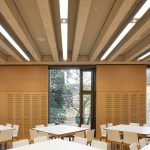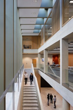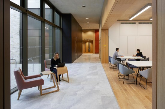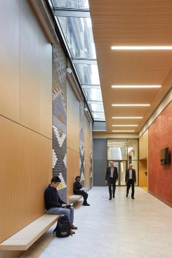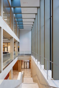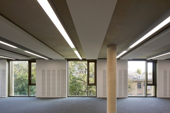 Internally, a network of spaces, differentiated in scale and character, provides an engaging, high quality environment for staff and students. These spaces have been designed to provide access to views, a strong sense of materiality and an appreciation of varying qualities of daylight. The majority of the building is also naturally ventilated and locally controlled as part of an innovative and sustainable environmental strategy. The sequence of spaces has been designed to promote interaction between students, delegates and staff through the provision of generous foyer and circulation spaces which create opportunities for informal meetings and discussion. These spaces extend the existing foyers and stairs which characterise the successful social heart of the existing building.