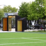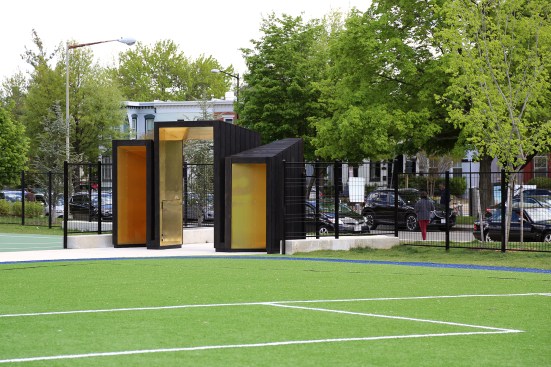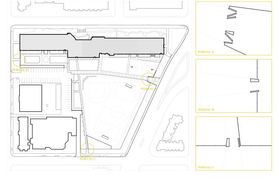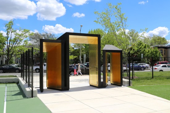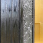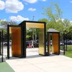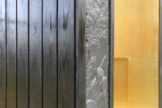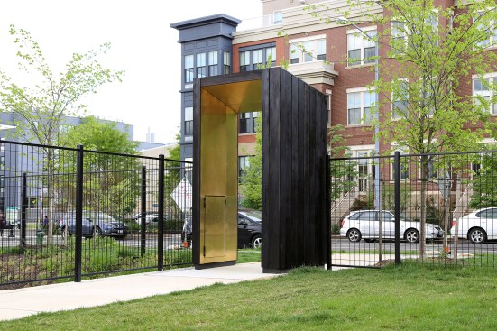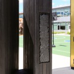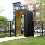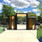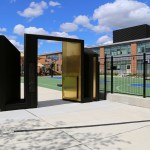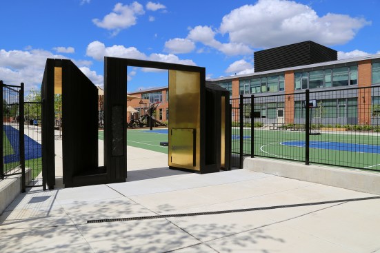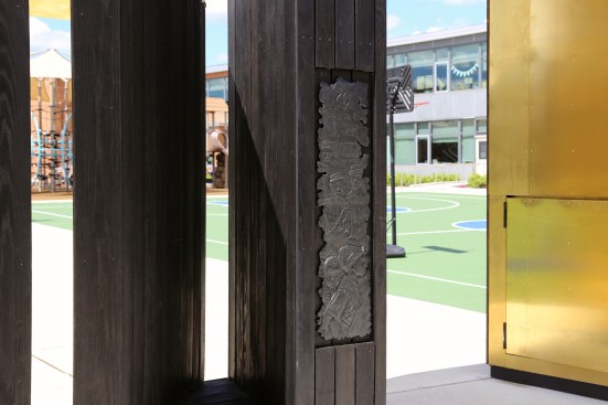 The Camp Barker Memorial honors Garrison Elementary School's history as the site of a 'contraband camp.' The original buildings were developed as barracks for Civil War soldiers but later became temporary accommodations for formerly enslaved persons, legally considered ‘contraband’ at the time. The portals recall the informal settlement of Camp Barker, with a series of structures which vary in scale, allowing for passage and spaces for reflection. The exterior charred wood recalls the strength and hardship of the community that grew out of this camp. Hardened and enduring, charred wood is UV, weather, rot, fire, and insect resistant. The reflective brass interior asks viewers to see and consider themselves in relationship to the site’s history. The portals feature narrative bas relief panels by sculptor Vinnie Bagwell.