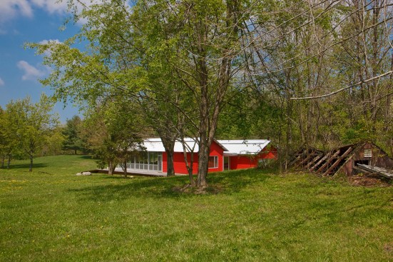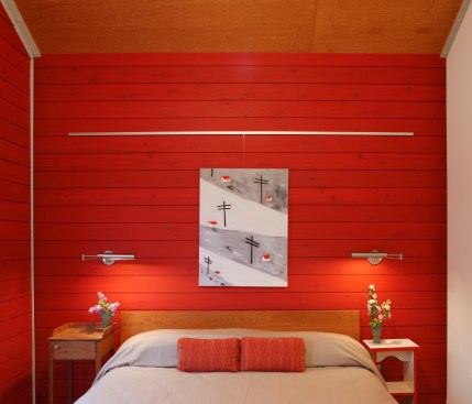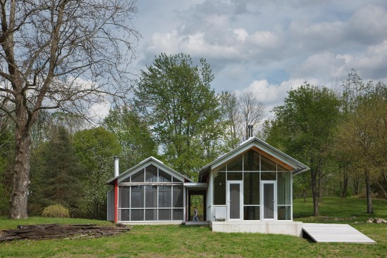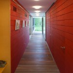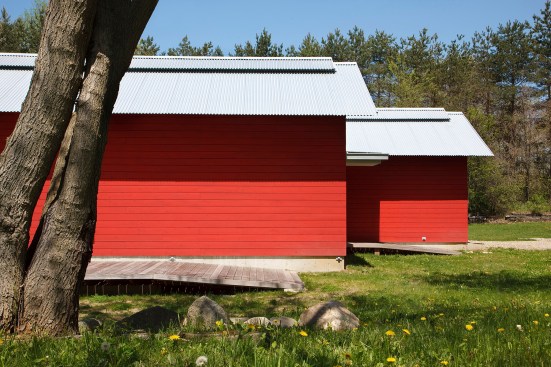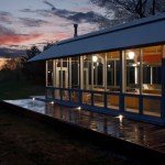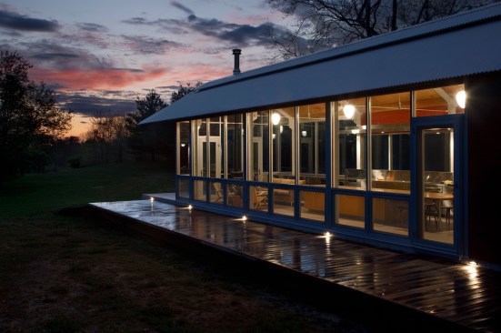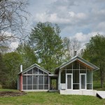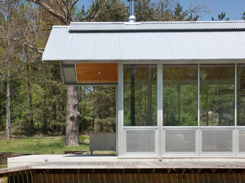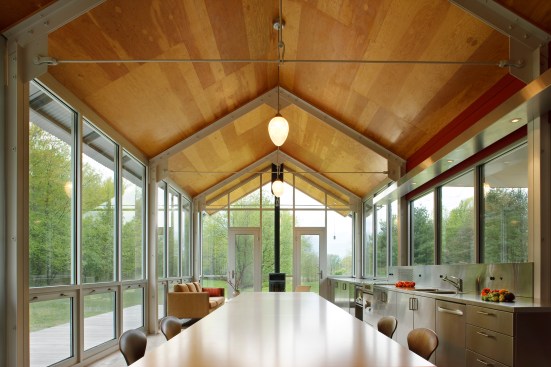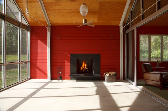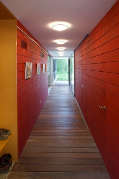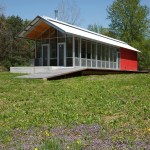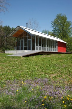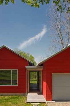 Set on eight acres of rolling Indiana farmland, the scale, siting and language of this second home and artist’s studio is rooted in the vernacular. The siting of the project emphasizes the length of the site while taking advantage of its unique features. Communal spaces wrapped with floor-to-ceiling window walls provide long views toward the open meadows. Private spaces are absorbed into the building towards the more protected and densely planted portion of the site. Two sixteen-foot wide gable-roofed volumes are connected and mediated by the floating entry boardwalk. The painted wood siding wraps from the exterior to interior, emphasizing the autonomy of the volumes while blurring the boundary of inside and out. The internal steel framework provides rhythm and scale, while the concrete floors and douglas fir plywood provide tactility and warmth. The simple forms, materials and modest scale that compose the architectural palette are complementary and consistent with the program and place of this humble project.