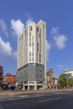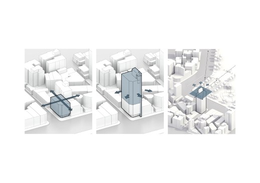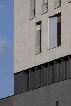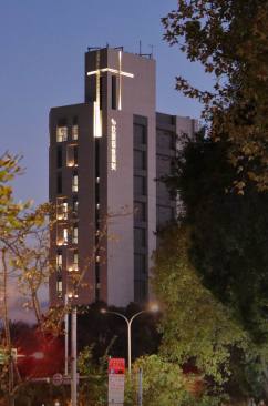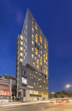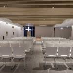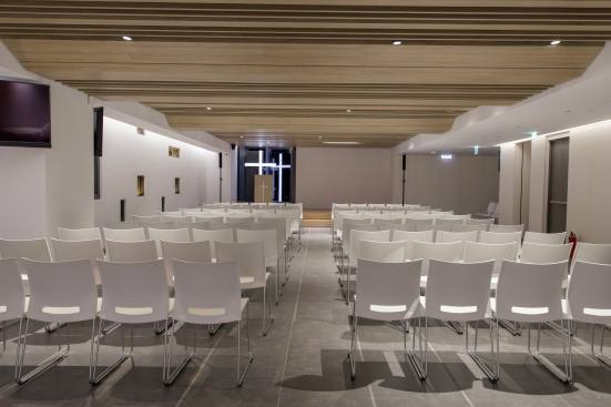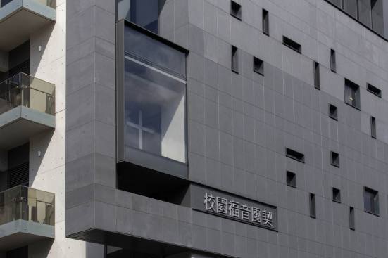 The religious expression of the cross as the main visual element is articulated at two locations. One is at the corner of the assembly hall, expressing the passage from day to night with light and shadow. The other one is sculpted from the solidity of the service core facing the urban axis and main entrance of the NTU Campus, like a beacon that attracts the attention of passersby and students, inspiring their curiosity toward the indoor activities.