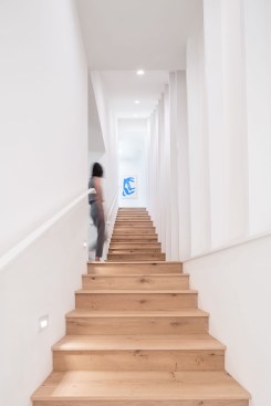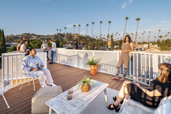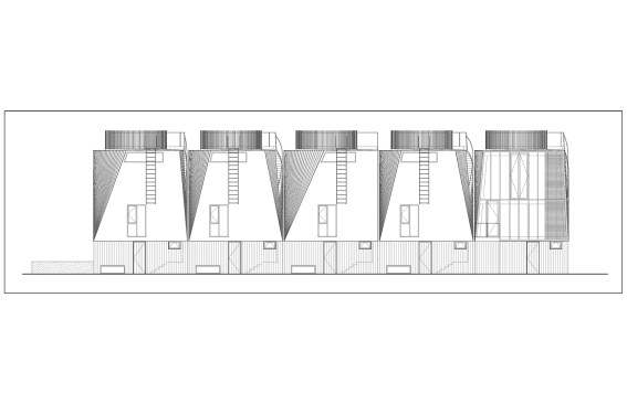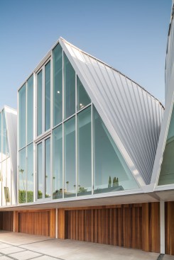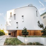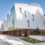 Canyon Drive, a multifamily housing development by Lorcan O’Herlihy Architects, rises like five swelling white caps amid the palms south of Los Angeles’ Hollywood Hills. Designed with the city’s tight housing market and the 2005 Small Lot Subdivision Ordinance in mind, the project creatively explores the outer limits of a small-footprint typology. Beginning with the maximum allowable envelope, the design tilts exterior walls at different angles away from the lot lines, creating five unique, light-filled residences that assume the form of expanded A-frames. The project deploys a simple and curved panelized system for its exterior wood frame, deftly providing privacy from neighbors, and mirrors itself internally with elegant, white-ribbed rooms illuminated by glazed curtain walls. A cedar-clad first-floor exterior housing a two-car garage warms the structure. To maintain density, the design swaps traditional yards for rooftop decks with views of LA. The results are single-family homes that are cohesive but maintain their individuality.