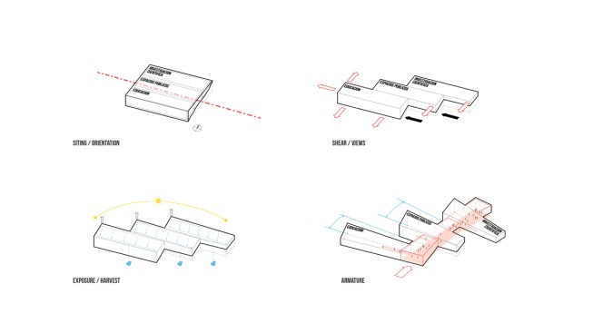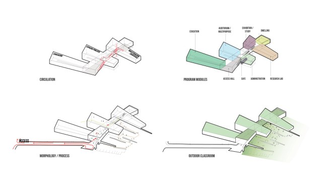 The site for the Cape Horn Sub-Antarctic Center faces the Beagle Channel in Puerto Williams, a town on Navarino Island in the Chilean Sub-Antarctic Province that is defined by its cultural heritage and lies within the UNESCO Cape Horn Biosphere Reserve. The Center is comprised of three Sub-Antarctic Center Programs: Education, Sustainable Tourism and Sub-Antarctic Transdisciplinary Research, each housed in its own pavilion along a primary axis that is oriented for optimum solar exposure and protection from the harsh climate. The Southernmost pavilion houses the educational spaces for sustainable tourism and biocultural conservation, including classrooms, a library and study spaces. The middle pavilion contains administration offices, a multipurpose lecture hall and café, and the northernmost pavilion contains an exhibition space, research and laboratory facilities for transdisciplinary research and two apartments for visiting researchers.