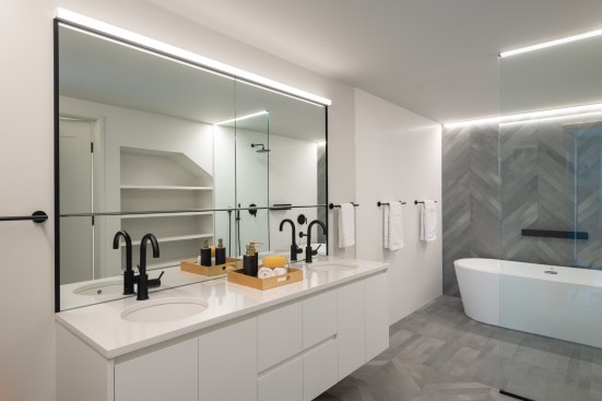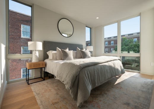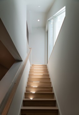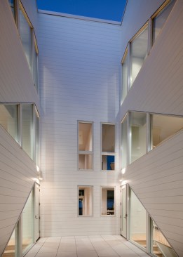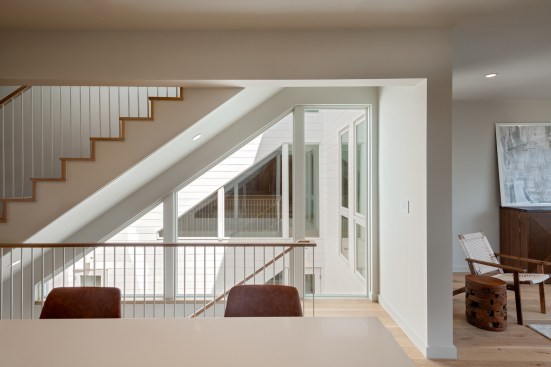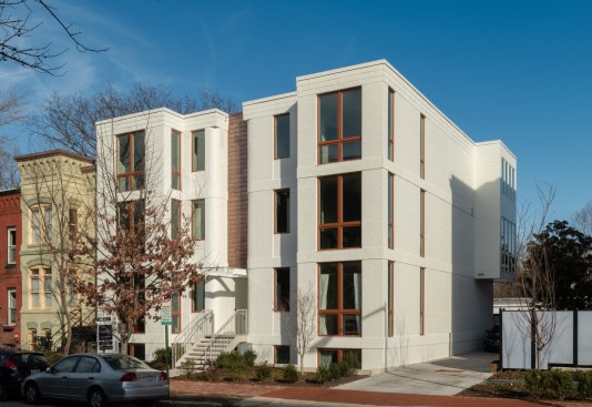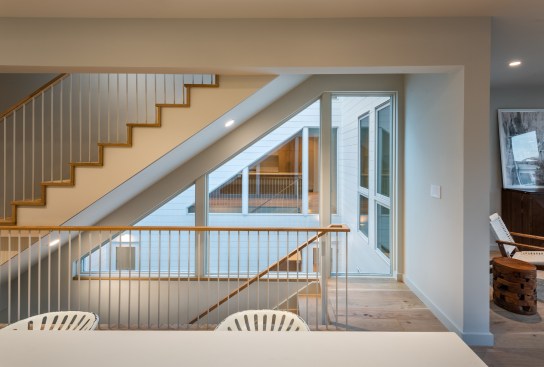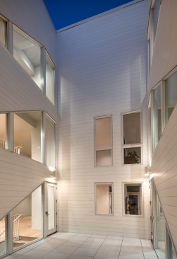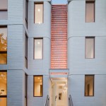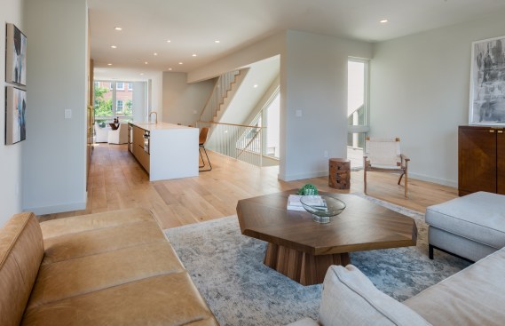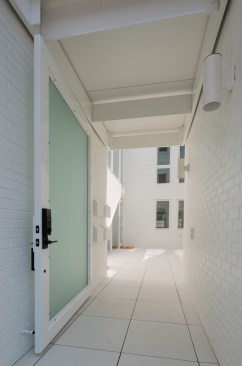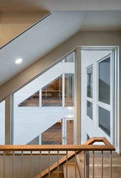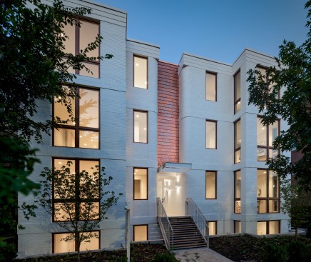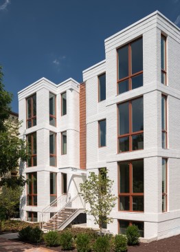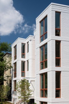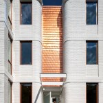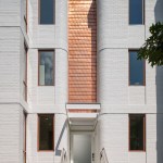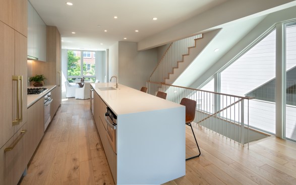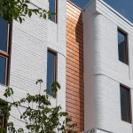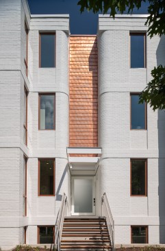 The project is a mirrored pair of two-over-two residences on property that was once a surface parking lot. When the lots were subdivided, they were sized to extend the existing bay pattern of the adjacent historic rowhomes – plus an extra 5 feet, enough for a sheltered passage to a shared interior courtyard from which each of the units is accessed. While the majority of the building’s visible facade pays homage to its historic setting in painted brick, a slice of copper shingles above the shared entry draws interest from the street. Large window openings maximize transparency on the courtyard’s opposing sides, activating the shared exterior space and imbuing the center of the units with natural light. Public living areas are located on the 1st and 2nd levels, adjacent to the courtyard, and private living areas are located on the cellar and 3rd levels. Vertical circulation is stacked along the courtyard to buffer the interior living spaces.